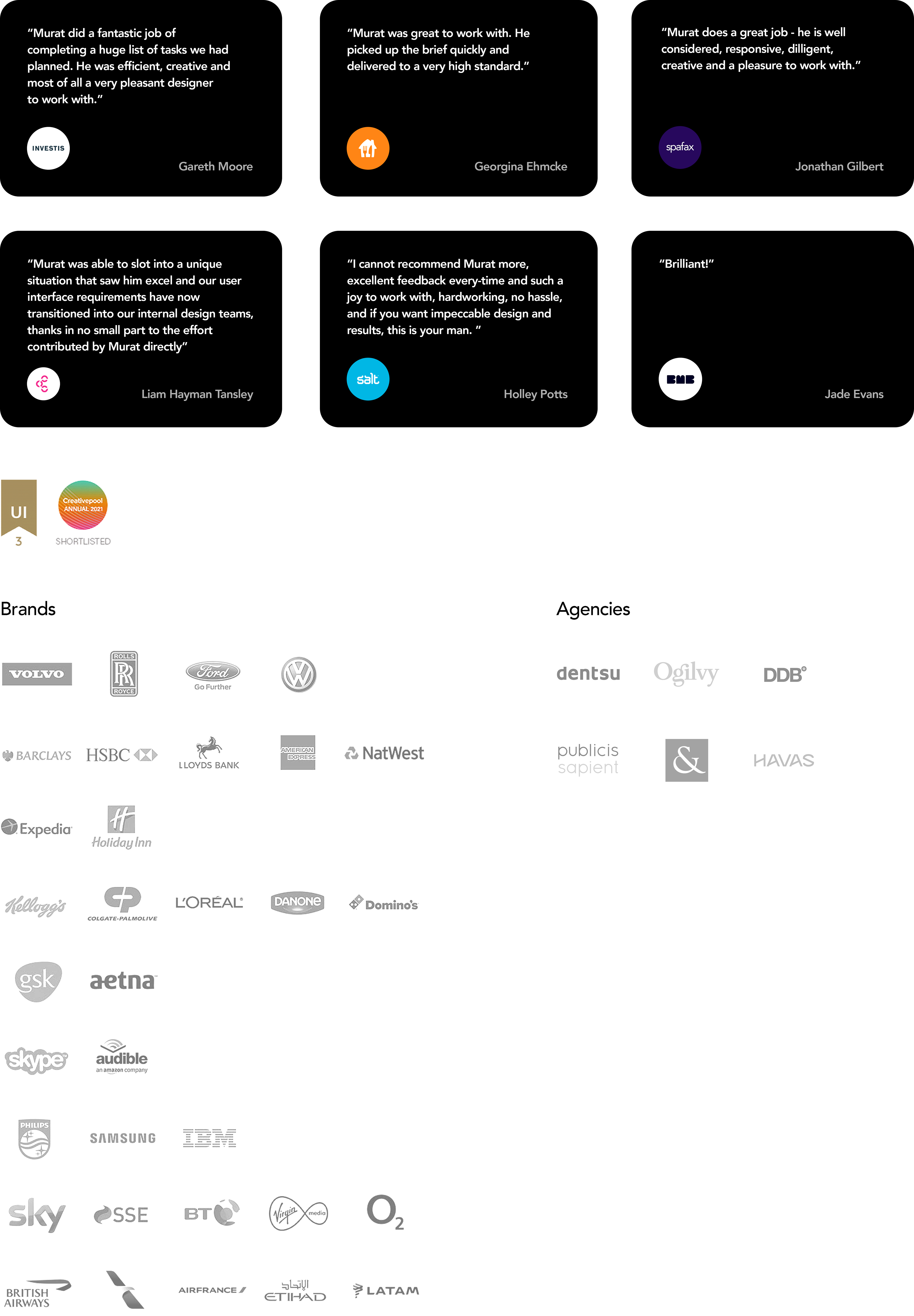 Hello, I'm Murat, a senior Multidisciplinary Designer specializing in all things digital and with 14 years of professional experience in the industry. Work covering mainly UXUI Product Design, spanning over 50 world leading brands ranging vastly from American Express to Coca Cola. My aim from the get go has always been to push the boundaries in creating immersive but also functional design and luckily I have had the privilege of doing so for some top notch international brands. My ethics have always been to strictly stick to the fundamentals of clean and contemporary design whilst maintaining a solid balance of being recognisable, functional and simple. I believe good design is little design as possible and that UX UI is designed best holistically.